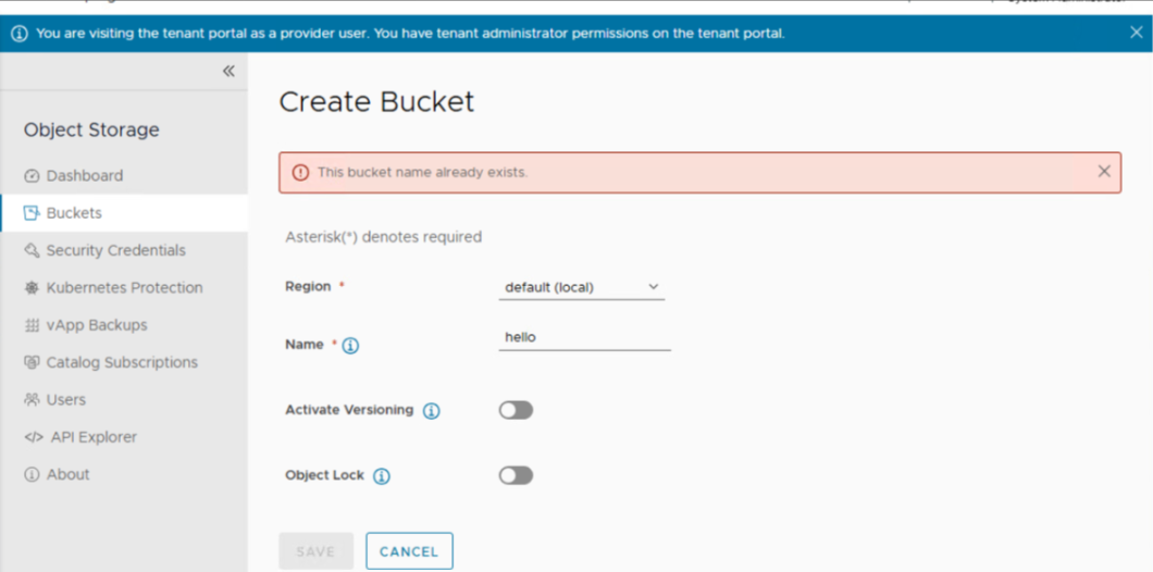 If the IAM user does not have full "read" and "write" privileges for bucket operations, MinIO returns 403 Forbidden, which OSE incorrectly displays as a bucket-exists error.