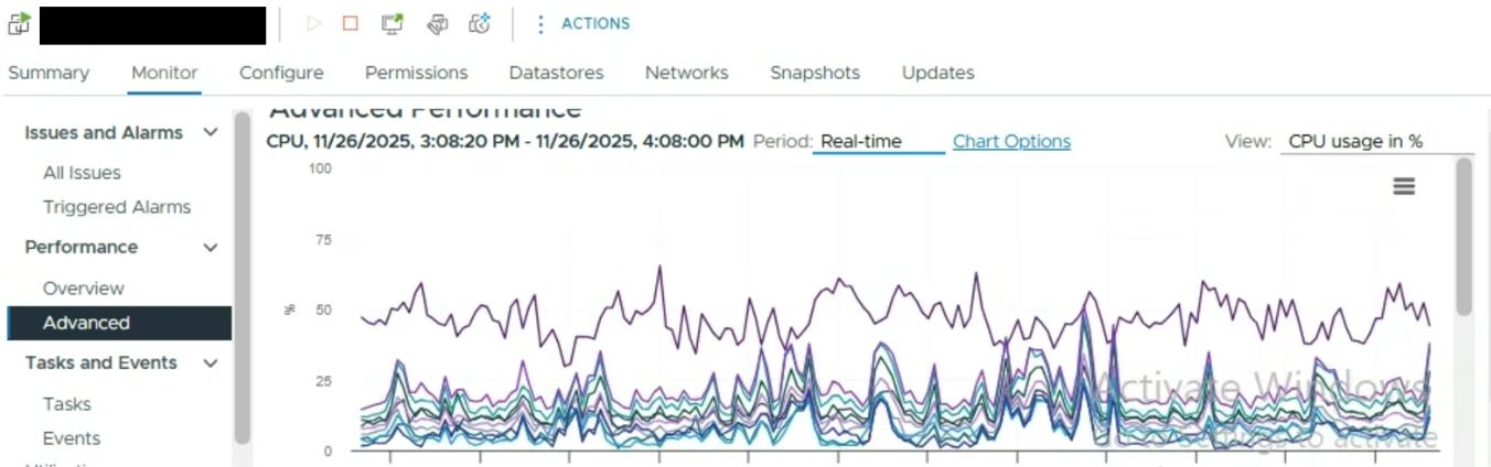 In vCenter, the performance chart shows a high percentage of CPU usage: