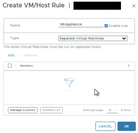 Create a VM/Host Rules of type "Separate Virtual Machines" to keep the two HCX Network Extension (NE) appliances on separate ESX hosts. vCenter Distributed Resource Scheduler (DRS) will instantly ensure the virtual machines are placed on distinct ESXi hosts.