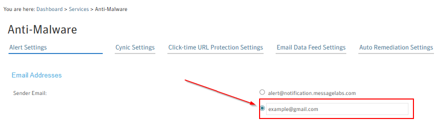 Users have the option to customize the sender email address in the Anti-Malware settings, as shown in the screenshot.
