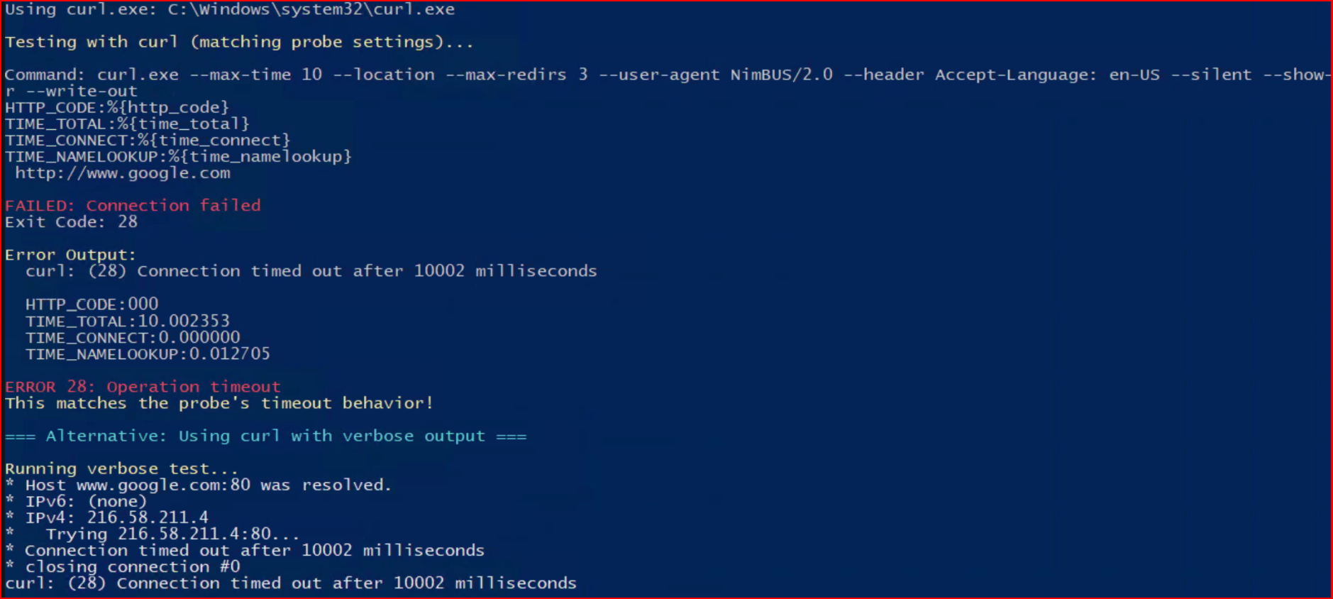 Could you check with your network team to identify the root cause of why the curl command is failing when executed manually against a simple URL (e.g., www.google.com)?