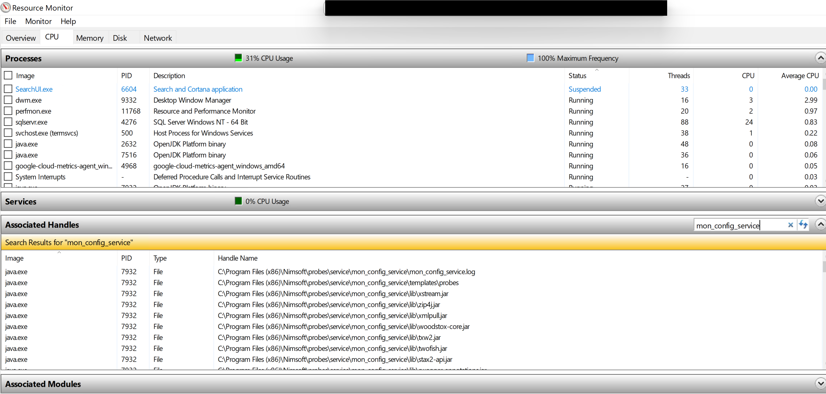Using windows resource monitor we could see two java processes with different pids having associated handles on the mon_config_service folder on the Primary hub