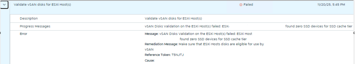 vSAN Disks Validation on the ESXi Host(s) failed: ESXi Host <Hostname> found zero SSD cache tier