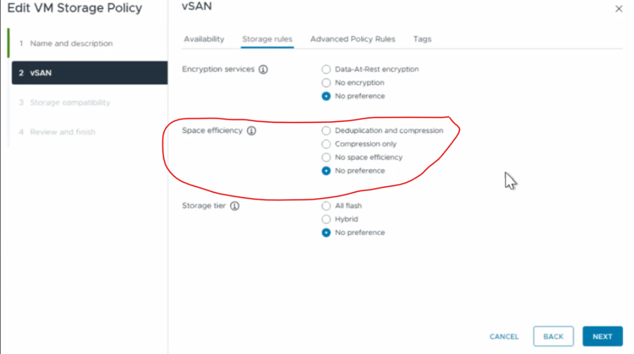 Note: With vSAN 8.0 ESA, the above has changed. With vSAN 8.0 ESA you can set compression per VM, and you actually do that using the policy storage rules.