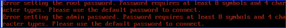 "Error setting the root password. Password requires at least 8 symbols and 4 character types. Please use the default password to connect" "Error setting the admin password. Password requires at least 8 symbols and 4 character types. Please use the default password to connect"
