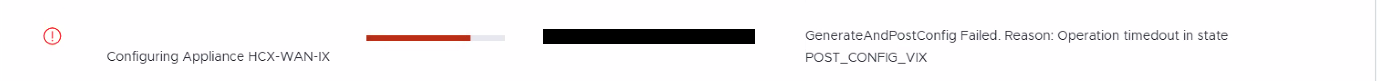YYYY-MM-DD HH:MM:SS.ms UTC [InterconnectService_SvcThread-19417, SM:servicemesh-cad2daa2-####-####-####-6cb0aceb0f70, IX:8e3d35b6-####-####-####-7a1afe79f7f2, J:57e5742a, , TxId: f3fbf831-####-####-####-28759f125694] ERROR c.v.v.h.s.i.ApplianceLifeCycleJob- ApplianceLifeCycleJob failed in state CHECK_IX_REACHABILITY. Error: Interconnect Service Workflow GenerateAndPostConfig failed. Error: Operation timedout in state POST_CONFIG_VIX.java.lang.RuntimeException: Interconnect Service Workflow GenerateAndPostConfig failed. Error: Operation timedout in state POST_CONFIG_VIX at com.vmware.vchs.hybridity.service.interconnect.AbstractInterconnectJob.getSubflowJobDataArray(AbstractInterconnectJob.java:758) at com.vmware.vchs.hybridity.service.interconnect.ApplianceLifeCycleJob.handleState(ApplianceLifeCycleJob.java:253) at com.vmware.vchs.hybridity.service.interconnect.AbstractInterconnectJob.run(AbstractInterconnectJob.java:217) at com.vmware.vchs.hybridity.messaging.LoggingJobWrapper.run(LoggingJobWrapper.java:41) at java.base/java.util.concurrent.Executors$RunnableAdapter.call(Executors.java:515) at java.base/java.util.concurrent.FutureTask.run(FutureTask.java:264) at java.base/java.util.concurrent.ScheduledThreadPoolExecutor$ScheduledFutureTask.run(ScheduledThreadPoolExecutor.java:304) at java.base/java.util.concurrent.ThreadPoolExecutor.runWorker(ThreadPoolExecutor.java:1128) at java.base/java.util.concurrent.ThreadPoolExecutor$Worker.run(ThreadPoolExecutor.java:628) at java.base/java.lang.Thread.run(Thread.java:829)YYYY-MM-DD HH:MM:SS.ms UTC [InterconnectService_SvcThread-19417, SM:servicemesh-cad2daa2-####-####-####-6cb0aceb0f70, IX:8e3d35b6-####-####-####-7a1afe79f7f2, J:57e5742a, , TxId: f3fbf831-####-####-####-28759f125694] WARN c.v.v.h.s.i.ApplianceLifeCycleJob- Error of unknown type : java.lang.RuntimeException