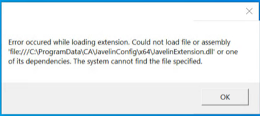 The error indicates an invalid library path to the dll file. This could be from an older Javelin installation that was never cleaned up after upgrading to a newer release.