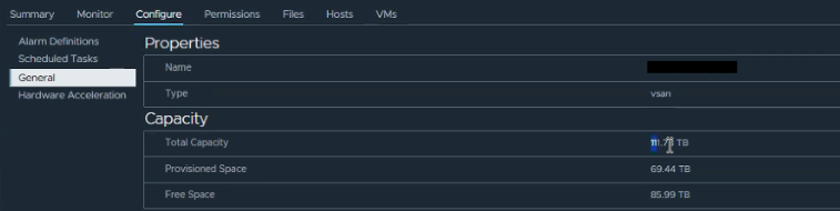 After the cluster reconfiguration the capacity shows greatly a reduced amount (27.95 TB in the example below)