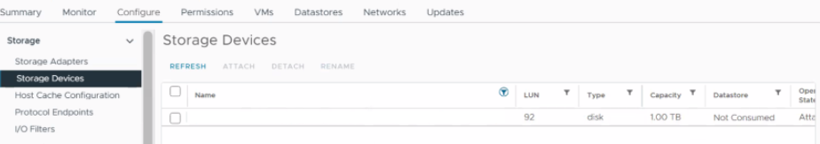 var/run/log/vmkernel.log file also reports "Address temporarily unmapped".2026-01-02T07:22:12.788Z Wa(180) vmkwarning: cpu46:28990779)WARNING: LVM: 17690: An attached device went offline. naa.##############################:1 file system [DATASTORE_NAME, ########-########-####-############]2026-01-02T07:22:13.016Z In(182) vmkernel: cpu46:28990779)Fil6: 4179: 'DATASTORE_NAME': Fil6 file IO (<FD c0 r1>) : Address temporarily unmapped2026-01-02T07:22:13.016Z In(182) vmkernel: cpu46:28990779)Fil6: 4141: ioCtx: 0x45bbdfb50580, world: 28990779, overallStatus: Address temporarily unmapped, token: 0x0, tokenStatus: N, txnToken: 0x0, txnTokenStatus: N, totalIOSize: 1048576, maxIOLength: 903086082026-01-02T07:22:13.016Z In(182) vmkernel: cpu46:28990779)Fil6: 4149: numAddrs: 0, numTbz: 0, numPBsToAlloc: 0, numBlocksToAlloc: 0 numTBZBlocks: 0, numPBsToUnmap: 0, numBlocksToUnmap: 02026-01-02T07:22:13.016Z In(182) vmkernel: cpu46:28990779)Fil6: 4155: opType: 1, ioFlags: 264, allocFlags: 0, ioStateTxn: 0, ioStateNoTxn: 1, txnState: 2, numResolvedAddrMaps: 16, numTxnPendingAddrMaps: 02026-01-02T07:22:13.016Z In(182) vmkernel: cpu46:28990779)Fil6: 4162: wakeupOnIOComplete: 12, isIOIssued: 0, isIODone: 0, isRead: 1 isSync: 1, canBlock: 1, lastPartialBlock: 0Perform a cluster level storage rescan.