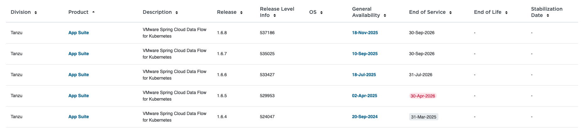 Spring Cloud DataFlow for Kubernetes which is the Open Source version is nearing End of Service by 3rd Quarter 2026. The screenshot below is taken from Broadcom's support lifecycle page