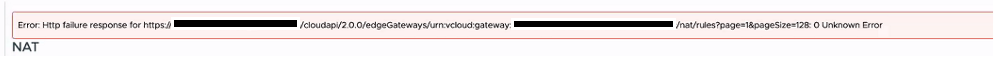 Error: Http failure response for https://<VCD_PUBLIC_FQDN>/cloudapi/2.0.0/edgeGateways/urn:vcloud:gateway:########-####-####-####-############/nat/rules?page=1&pageSize=128: 0 Unknown Error