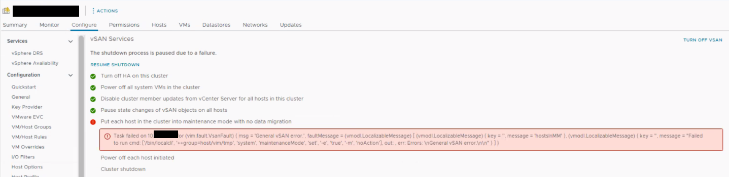 Task failed on 10.##.###.12 for (vim.fault.VsanFault) { msg = 'General vSAN error.', faultMessage = (vmodl.LocalizableMessage) [ (vmodl.LocalizableMessage) { key = '', message = 'hostsInMM' }, (vmodl.LocalizableMessage) { key = '', message = "Failed to run cmd: ['/bin/localcli', '++group=host/vim/tmp', 'system', 'maintenanceMode', 'set', '-e', 'true', '-m', 'noAction'], out: , err: Errors: \nGeneral vSAN error.\n\n" } ] }