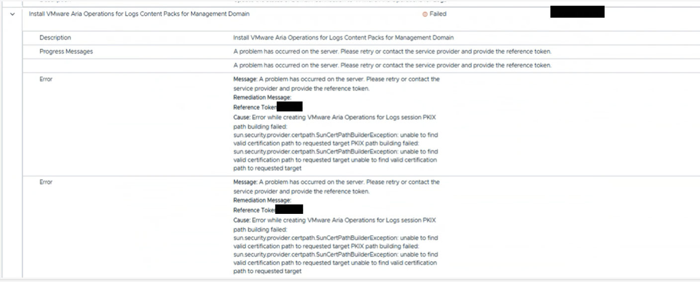 YYYY-MM-DDTHH:MM:SS.854+0000 ERROR [vcf_dm,69609e1f43875133e731b46dadb9a91c,57f9] [c.v.e.s.o.model.error.ErrorFactory,dm-exec-18] [NRPPL5] VCF_ERROR_INTERNAL_SERVER_ERROR Invocation of prefix '' part of task InstallContentPacksInVrli in plugin VrliContractPlugin failed with exception.com.vmware.evo.sddc.common.core.error.InternalServerErrorException: Invocation of prefix '' part of task InstallContentPacksInVrli in plugin VrliContractPlugin failed with exception.1at com.vmware.evo.sddc.orchestrator.core.ProcessingTaskSubscriber.invokeMethod(ProcessingTaskSubscriber.java:447)2at com.vmware.evo.sddc.orchestrator.core.ProcessingTaskSubscriber.processTask(ProcessingTaskSubscriber.java:520)3at4 com.vmware.evo.sddc.orchestrator.core.ProcessingTaskSubscriber.accept(ProcessingTaskSubscriber.java:124)at java.base/jdk.internal.reflect.NativeMethodAccessorImpl.invoke0(Native Method)at java.base/jdk.internal.reflect.NativeMethodAccessorImpl.invoke(NativeMethodAccessorImpl.java:77)at java.base/jdk.internal.reflect.DelegatingMethodAccessorImpl.invoke(DelegatingMethodAccessorImpl.java:43)at java.base/java.lang.reflect.Method.invoke(Method.java:569)at com.google.common.eventbus.Subscriber.invokeSubscriberMethod(Subscriber.java:85)567at com.google.common.eventbus.Subscriber.lambda8910$dispatchEvent$0(Subscriber.java:71)111213at com.vmware.vcf.common.tracing.TraceRunnable.run(TraceRunnable.java:5914)1516at java.base/java.util.concurrent.ThreadPoolExecutor.runWorker(ThreadPoolExecutor.java:1136)1718at java.base/19java.util.concurren20t.ThreadPoolExecutor$Worker.run(ThreadPoolExecutor.java:635)at java.base/java.lang.Thread.run(Thread.java:840)Caused by: com.vmware.evo.sddc.common.services.loginsight.api.LogInsightException: Error while creating VMware Aria Operations for Logs sessionat com.vmware.evo.sddc.common.services.loginsight.impl.LogInsightApiConfigurator.getSessionId(LogInsightApiConfigurator.java:270)at com.vmware.evo.sddc.common.services.loginsight.impl.LogInsightApiConfigurator.lambda$getHttpHeaders$0(LogInsightApiConfigurator.java:241)at com.vmware.evo.sddc.common.util.RetriableCallable.call(RetriableCallable.java:182)at com.vmware.evo.sddc.common.services.loginsight.impl.LogInsightApiConfigurator.getHttpHeaders(LogInsightApiConfigurator.java:246)at com.vmware.evo.sddc.common.services.loginsight.impl.LogInsightApiConfigurator.createVrliHttpClient(LogInsightApiConfigurator.java:227)at com.vmware.evo.sddc.common.services.loginsight.impl.LogInsightApiConfigurator.createVrliHttpClient(LogInsightApiConfigurator.java:220)at com.vmware.evo.sddc.common.services.loginsight.impl.LogInsightApiConfigurator.getResourceAsString(LogInsightApiConfigurator.java:209)at java.base/jdk.internal.reflect.NativeMethodAccessorImpl.invoke0(Native Method)at java.base/jdk.internal.reflect.NativeMethodAccessorImpl.invoke(NativeMethodAccessorImpl.java:77)at java.base/jdk.internal.reflect.DelegatingMethodAccessorImpl.invoke(DelegatingMethodAccessorImpl.java:43)at java.base/java.lang.reflect.Method.invoke(Method.java:569)at org.springframework.aop.support.AopUtils.invokeJoinpointUsingReflection(AopUtils.java:343)at org.springframework.aop.framework.ReflectiveMethodInvocation.invokeJoinpoint(ReflectiveMethodInvocation.java:196)at org.springframework.aop.framework.ReflectiveMethodInvocation.proceed(ReflectiveMethodInvocation.java:163)at org.springframework.aop.framework.CglibAopProxy$CglibMethodInvocation.proceed(CglibAopProxy.java:751)at org.springframework.retry.annotation.AnnotationAwareRetryOperationsInterceptor.invoke(AnnotationAwareRetryOperationsInterceptor.java:163)at org.springframework.aop.framework.ReflectiveMethodInvocation.proceed(ReflectiveMethodInvocation.java:184)212223at org.springframework.aop.framework.CglibAopProxy242526$CglibMethodInvocation.proceed(CglibAopProxy.java:751)at org.springframework.aop.framework.CglibAopProxy$DynamicAdvisedInterceptor.intercept(CglibAopProxy.java:703)2728at com.vmware.evo.sddc.common29.serv30ices.loginsight.impl.LogInsightApiConfigurator$$SpringCGLIB$$