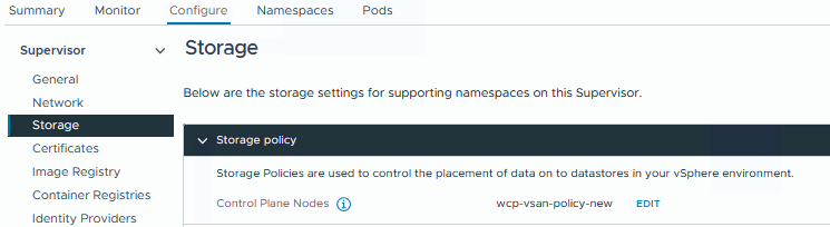 dcli com vmware vcenter namespacemanagement clusters update --cluster <cluster_moid> --image-storage-storage-policy <storage_policy_id> --ephemeral-storage-policy <storage_policy_id>