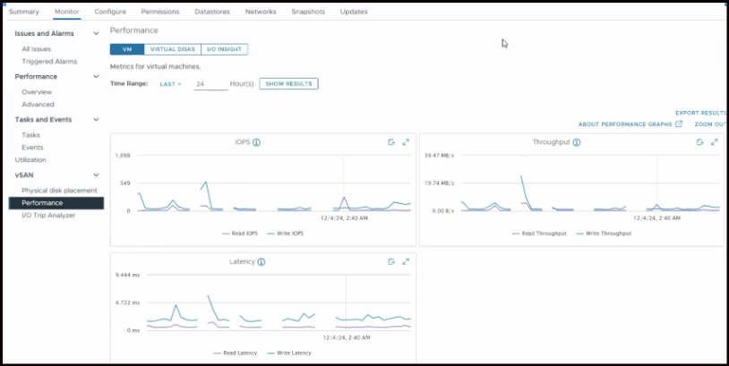 まれに、vSAN パフォーマンス統計ダッシュボードのチャートに断続的なギャップが表示されることがあります。この問題は主に、vSAN クラスタがVMware Aria Operationsと同一環境で利用され、vSANのパフォーマンス統計をキューに入れるためにワイルドカードクエリがトリガーされた場合に発生します。
