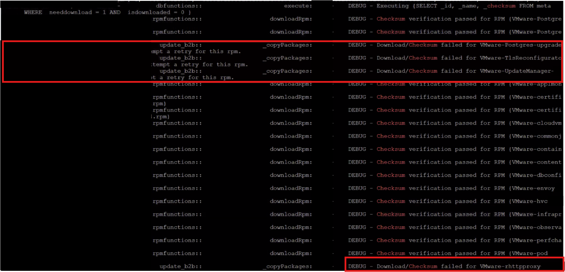 The ISO file used for staging is corrupted. The file size does not match the original ISO available on the Broadcom site, and some of the checksum validations fail during the staging process.