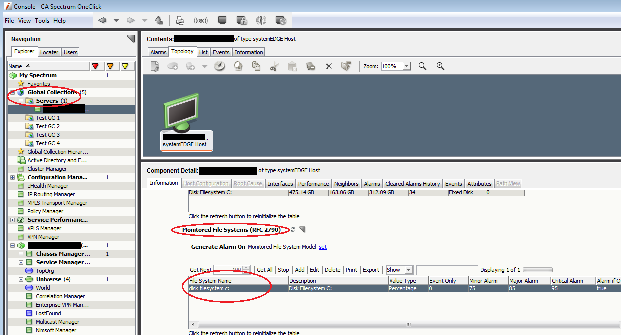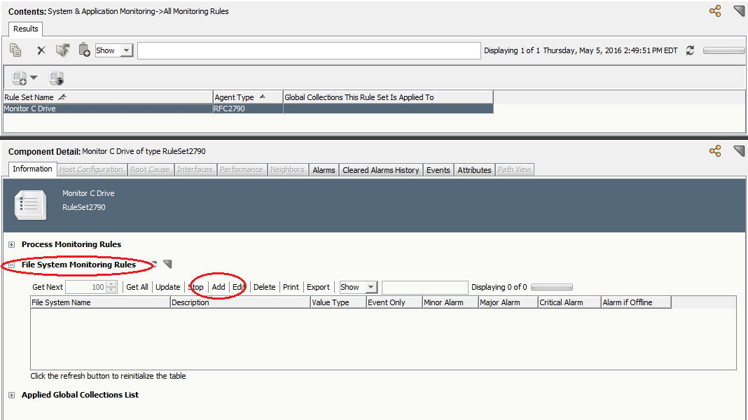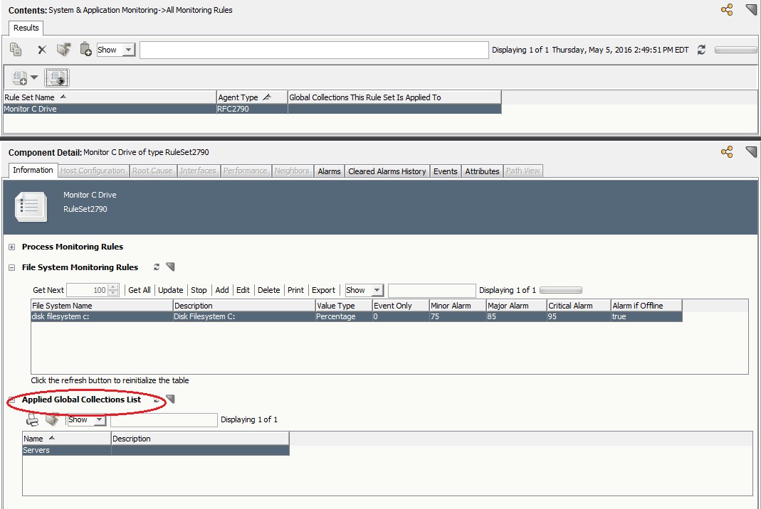 12. Go to the Global Collection where the rule was applied. Select one of the models. Click on the Information tab. Expand the System Resources -> File Systems -> Monitored File Systems (RFC 2790) subview. You should see the rule has been applied. All models currently in and any models added to the Global Collection will automatically inherit the rule.