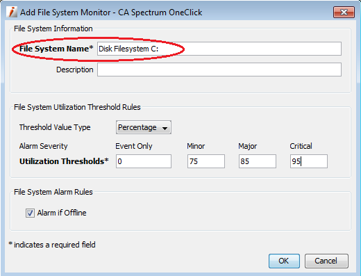 7. Enter the name of the file system to monitor in the "File System Name" field. Configure how you wish to monitor the file system. Then click the OK button