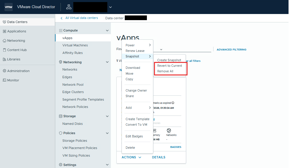 VMware Cloud Director 10.6 supports the creation of vApp snapshots, but the "Revert to Current" and "Remove All" options are selectable (not grayed out) even for a vApp that does not have a vApp snapshot.