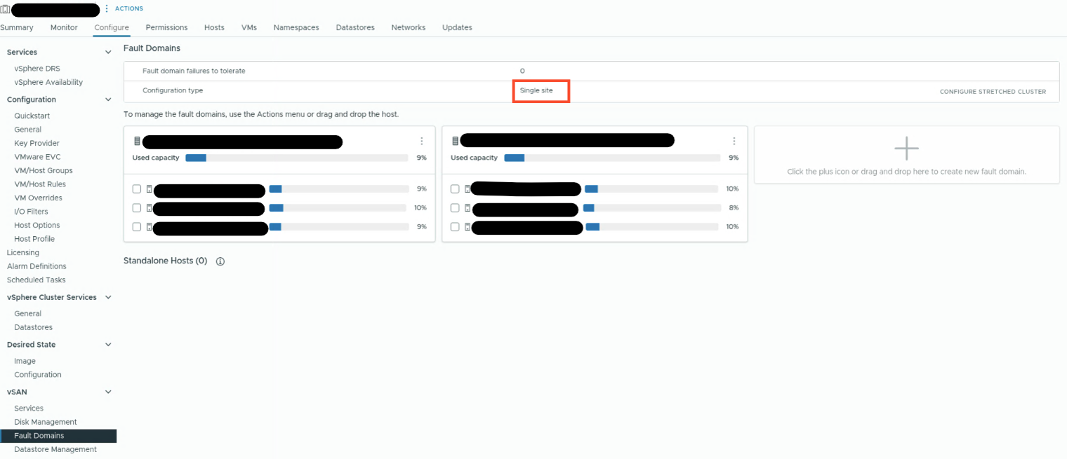 When logged-in to the vSphere Client using a vSphere user with Read-only permissions, UI pane at Cluster > vSAN > Configure > Fault Domains may incorrectly show the cluster as 'Single site' instead of 'Stretched cluster' and Witness info section absent: