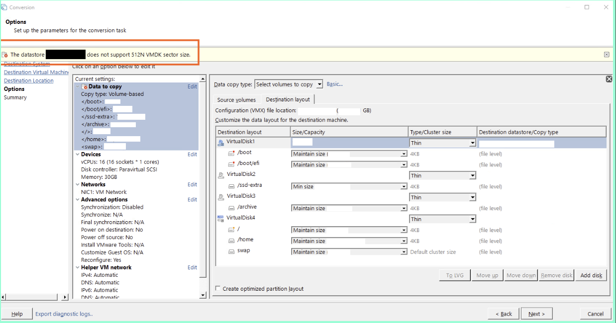 "datastore does not support 512N VMDK sector size" VMware Converter Standalone 9.x