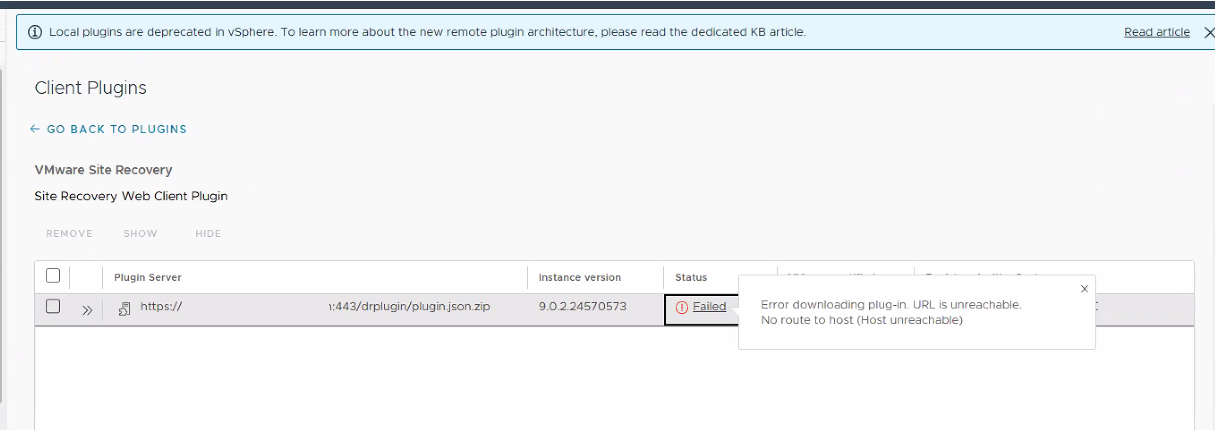 Once the appliance is configured successfully via the VAMI, returning to the vSphere Client displays the below error. The status of the plugin can also be verified under vCenter Server Menu > Administration > Client plugins