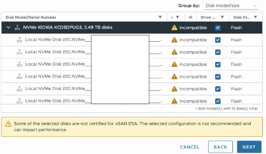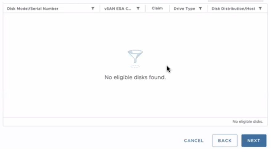 1. NVME disks are not available to claim during vSAN ESA cluster creation task. We see below error in UI if the disks are already formatted or have partitions -