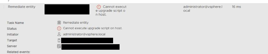 YYYY-MM-DDTHH:MM:SS error vmware-vum-server[PID] [Originator@6876 sub=HU-Upgrader] [upgraderImpl ##] Script execution failed on host: <ESXi Management IP>)YYYY-MM-DDTHH:MM:SS info vmware-vum-server[PID] [Originator@6876 sub=VciRemediateTask.RemediateTask{##}] [vciTaskBase 1496] SerializeToVimFault fault: (integrity.fault.HostUpgradeRunScriptFailure) { faultTypeId = "com.vmware.vcIntegrity.HostUpgradeRunScriptFailure", (vim.KeyValue) { key = "reason", value = ""