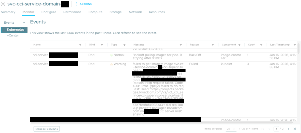 message": "failed to sync pod \"svc-cci-service-domain-<domain id>/cci-service-<uuid>" in the provider: failed to pull images: failed to get images: Image svc-cci-service-domain-<domain id>/cci-supervisor-serv-<uuid> has failed. Error: Failed to resolve on node <ESXI host name>. Reason: Http request failed. Code 400: ErrorType(2) failed to do request: Head \"https://projects.packages.broadcom.com/v2/vcf_cci_service/cci-supervisor-service/manifests/sha256:<SHA Value>\": dial tcp: lookup projects.packages.broadcom.com on <IP of DNS server configured in workload network settings>:53: server misbehaving: ErrImagePull",