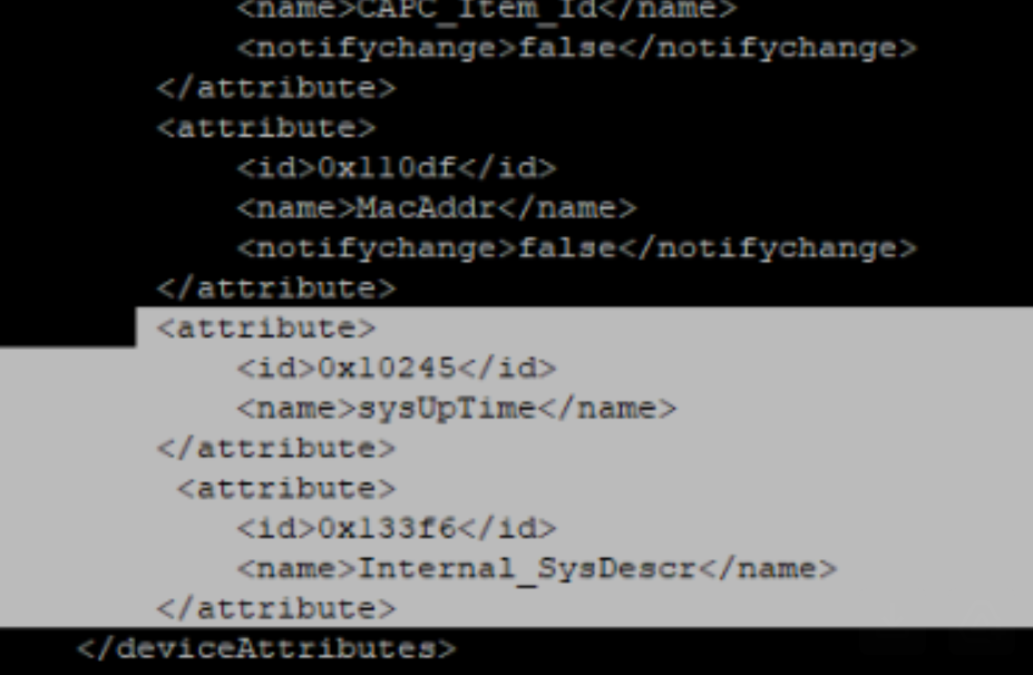 </attribute>IMPORTANT: add the new attributes inside of the device attributes section. for example to add sysUpTime or Internal_SysDescr