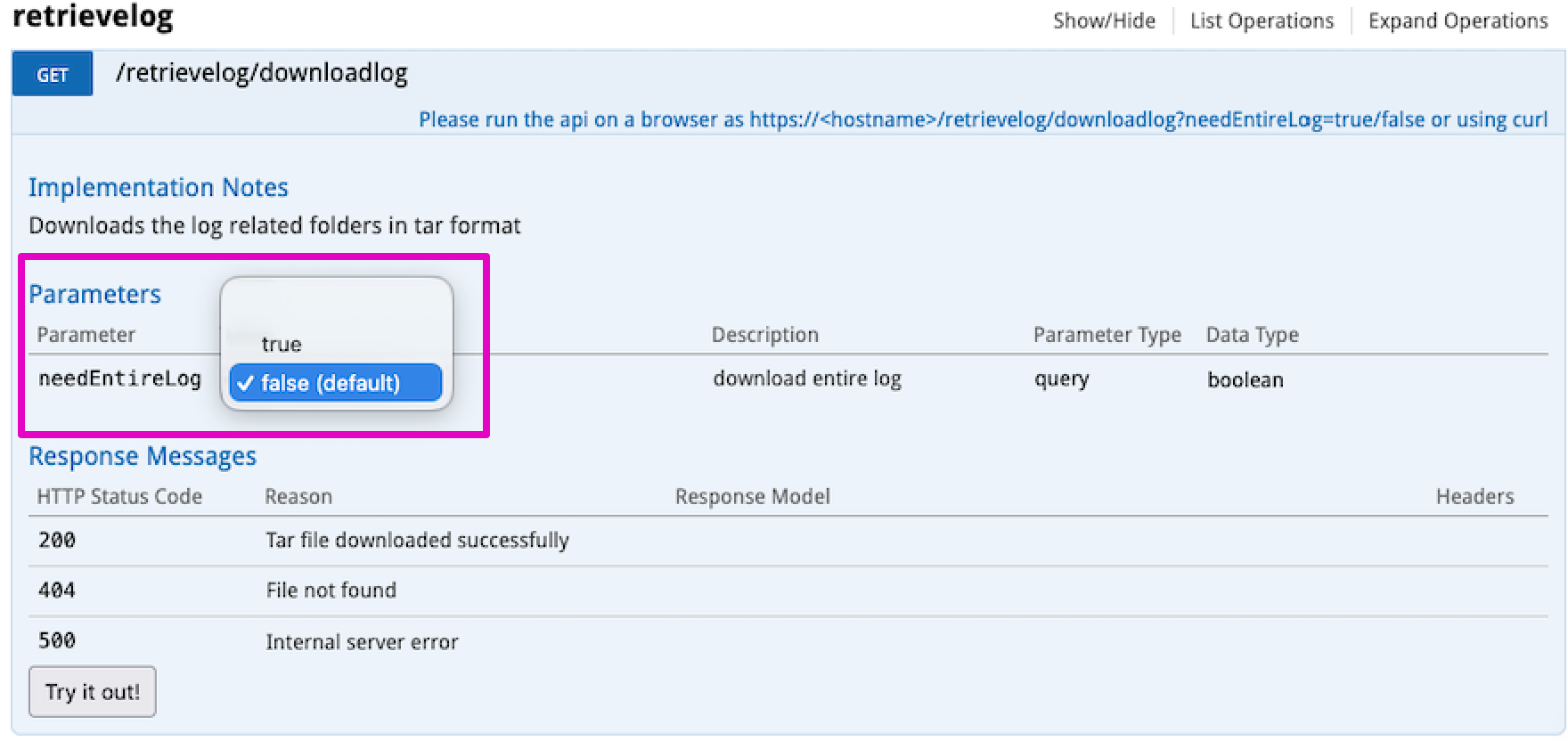 https://<hostname>/retrievelog/downloadlog?needEntireLog=false