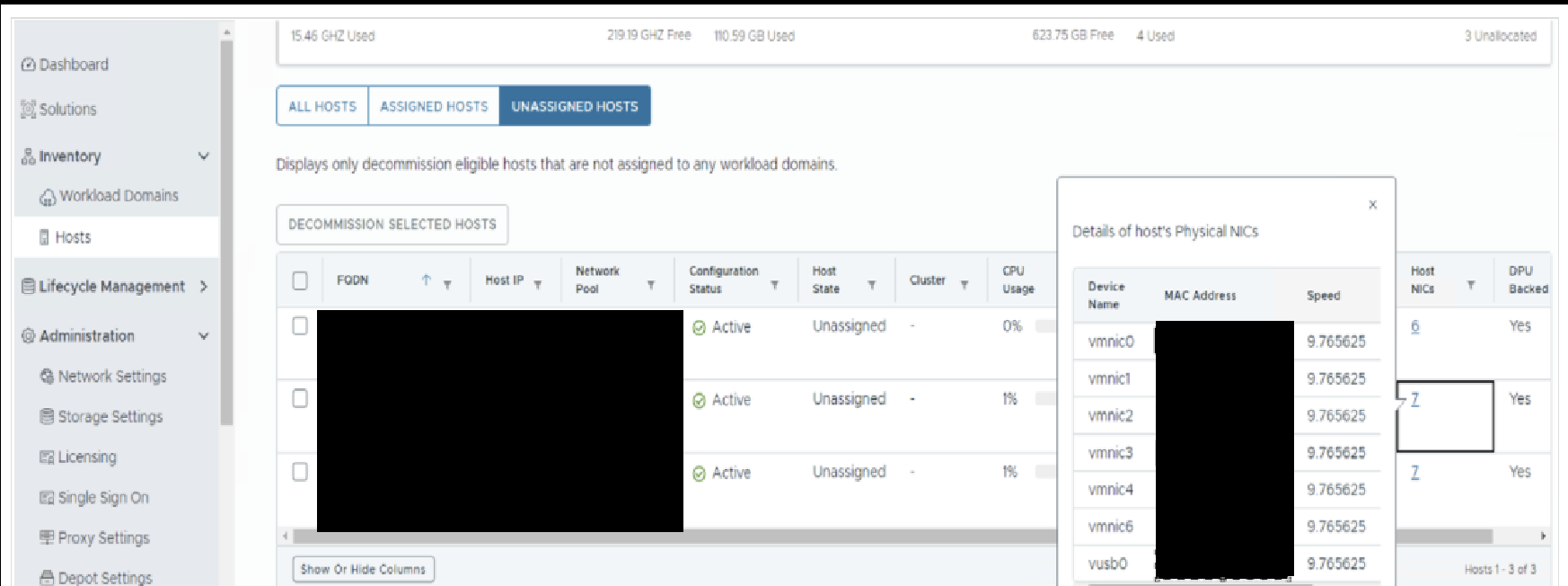 A product issue exists in the SDDC Manager inventory logic where the algorithm used to calculate and display virtual switch profiles fails if the total physical interface count is an odd number. The presence of the vusb0 interface often creates this odd-numbered count, interfering with the DVS migration logic during commissioning or cluster expansion.