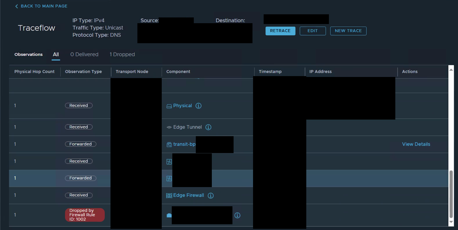 Verification via NSX Traceflow shows: Packet dropped by Rule 1002.