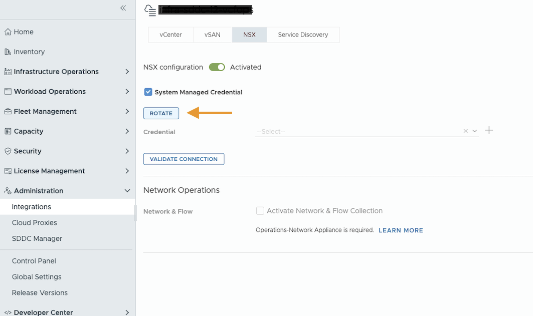 On the domain page, click the NSX tab. Next to 'System managed credentials', click 'Rotate'.