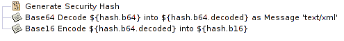 A Gateway service policy can be authored to decode and re-encode hashed data into an appropriate format. A hash operation is performed upon binary data and then encoded in a certain way for consumption. The Gateway encodes the raw hashed binary data in Base64 whereas other applications might encode it in Base16. The following service policy displayed below will hash a string, decode it, and re-encode it in Base16:
