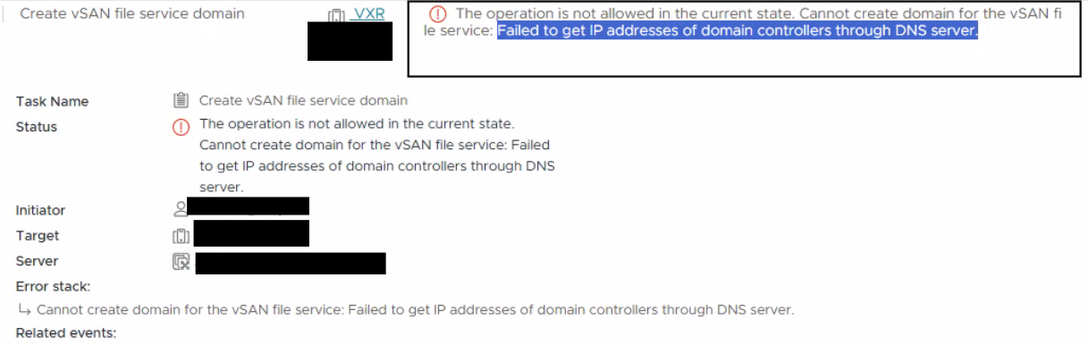 " The operation is not allowed in the current state. Cannot create domain for the vSAN file service: Failed to get IP addresses of domain controllers through DNS server.
