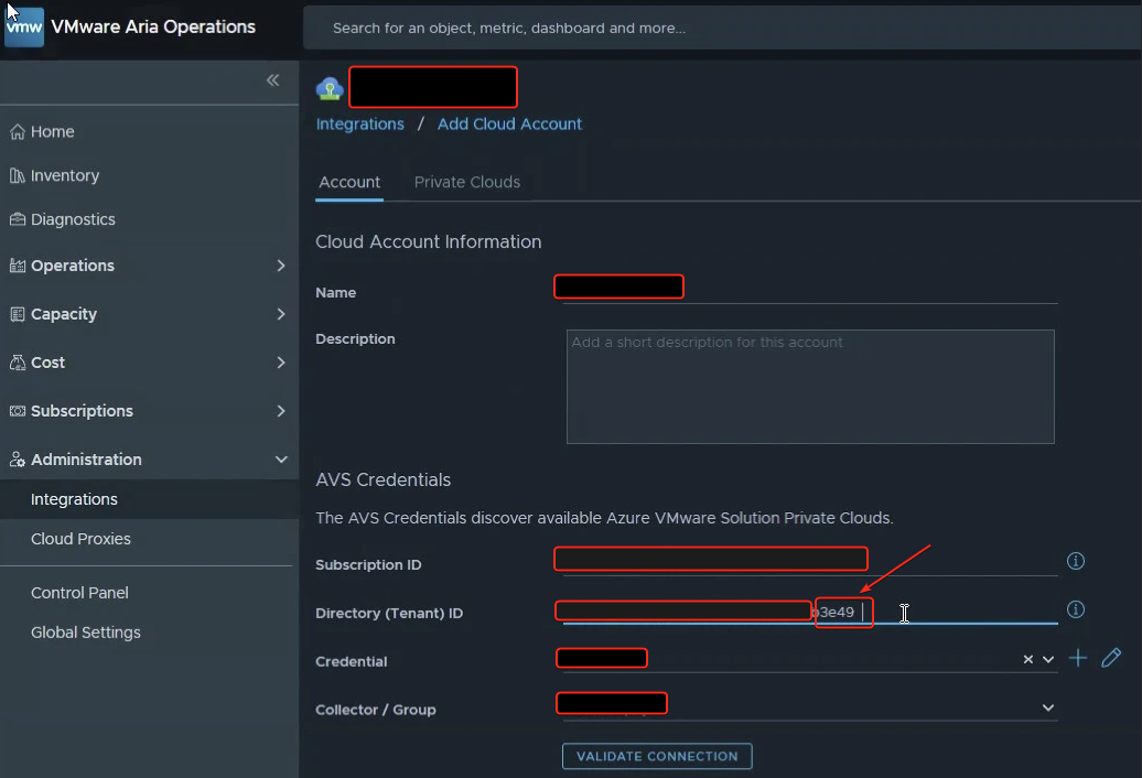 When attempting to configure or validate the Azure VMware Solution (AVS) Private Cloud Adapter in VMware Aria Operations, the configuration fails with the following error: