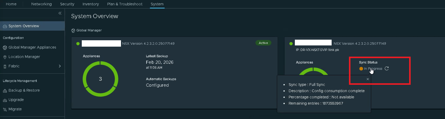 The Standby Global Manager (GM) Sync status remains in a "In Progress" state in the NSX manager GUI as shown in the screenshot below: