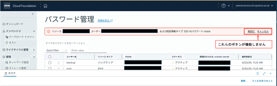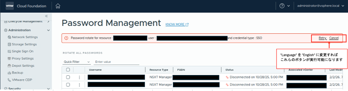 SDDC Manager 9.0.x のユーザーインターフェース (UI) において、言語設定を英語以外(日本語、フランス語、スペイン語など)に設定している場合、タスクの「再試行 (Retry)」および「キャンセル (Cancel)」ボタンをクリックしても反応しないことがあります。 クリック時にエラーメッセージは表示されませんが、期待されるアクション(タスクの再開や停止)が開始されません。