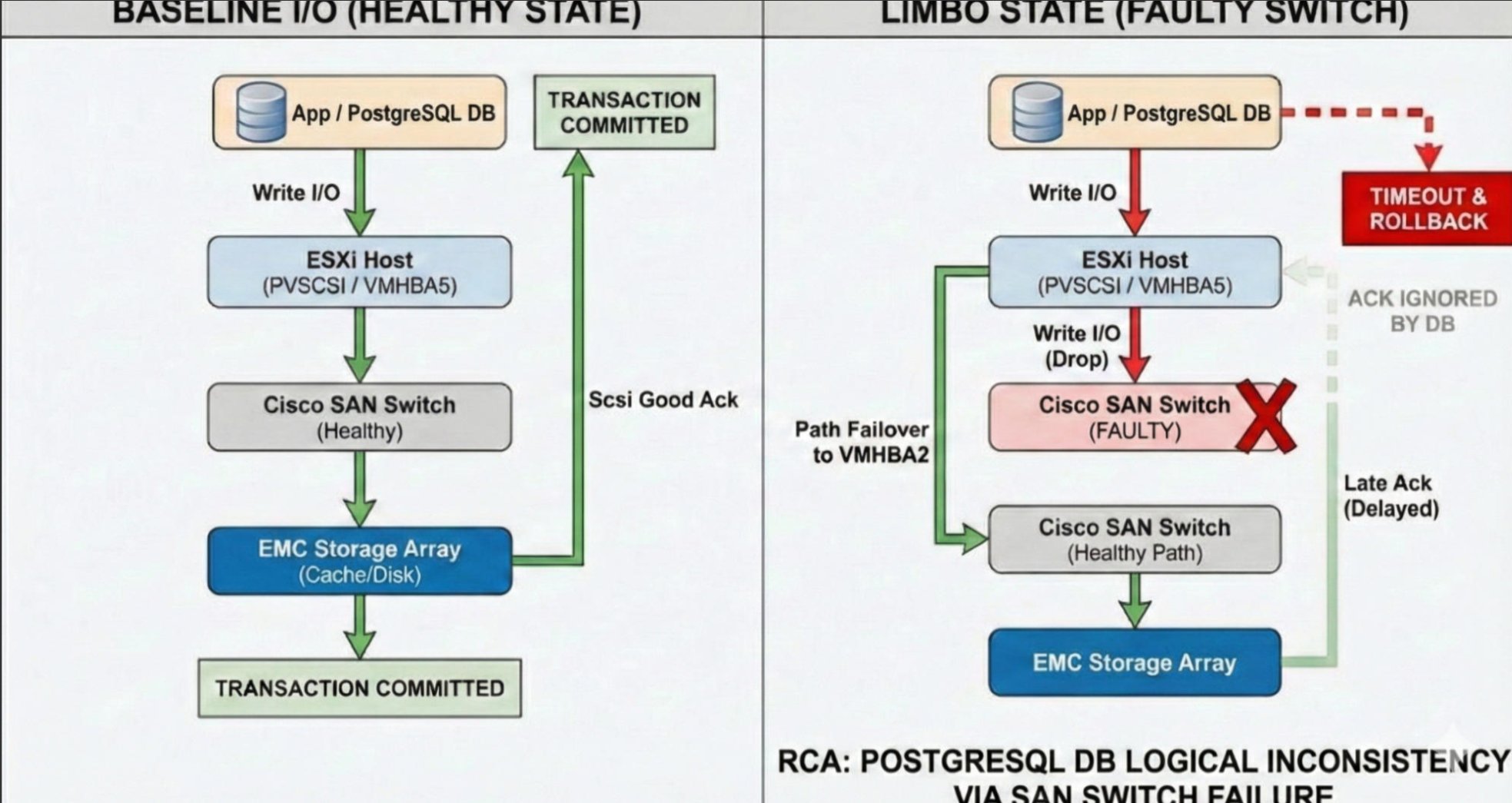 fsync() or fdatasync()) to force the Write-Ahead Log (WAL) to permanent storage.fsync() request, translates it into block-level SCSI commands, and hands it to the virtual storage controller—in this case, the VMware Paravirtual SCSI (PVSCSI) adapter.Note: In a healthy state, this entire round-trip (from Step 1 to Step 8) happens in sub-millisecond times (often less than 0.5ms on modern All-Flash arrays). PostgreSQL's entire data integrity model relies on the assumption that if it receives that "SCSI Good Ack" from the OS, the data is permanently safe on disk.