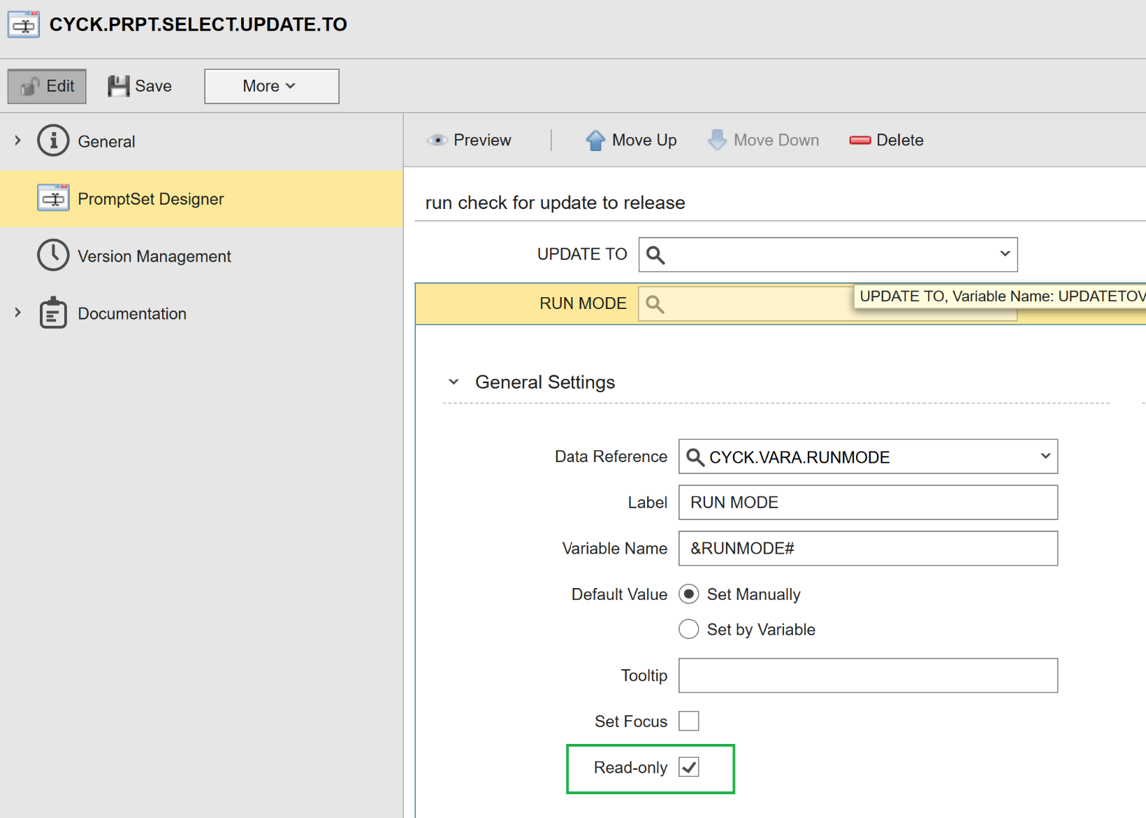 Edit the CYCK.PRPT.SELECT.UPDATE.TO Promptset (as you would see that the RUNMODE is set to read-only)