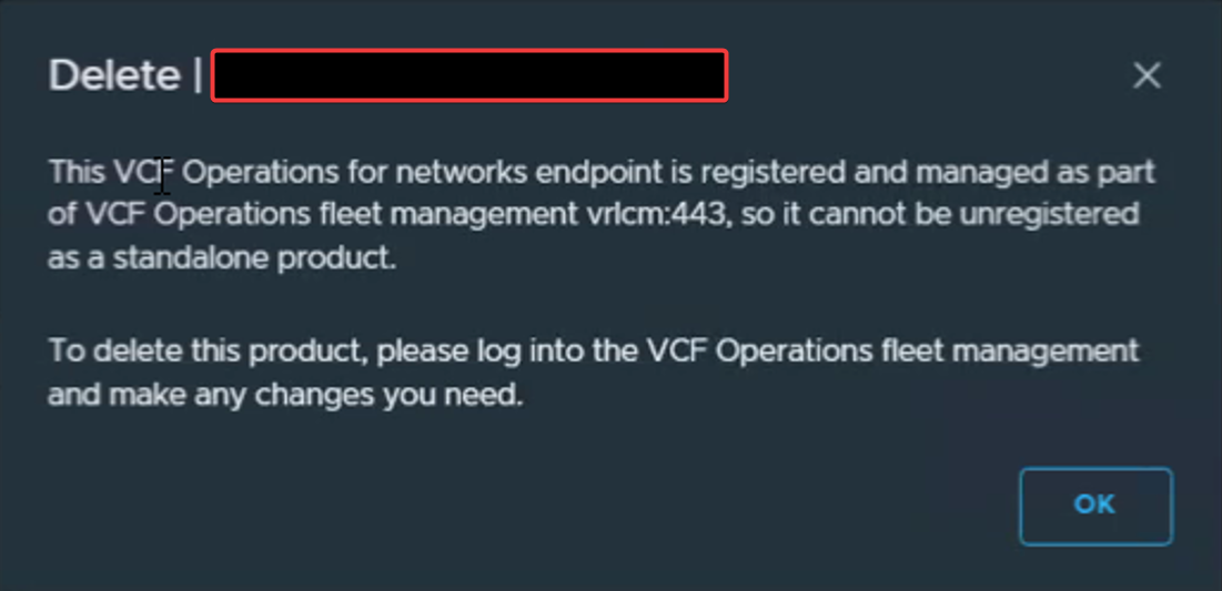 "This VCF Operations for networks endpoint is registered and managed as part of VCF Operations fleet management vrlcm:443, so it cannot be unregistered as a standalone product. To delete this product, please log into the VCF Operations fleet management and make any changes you need."