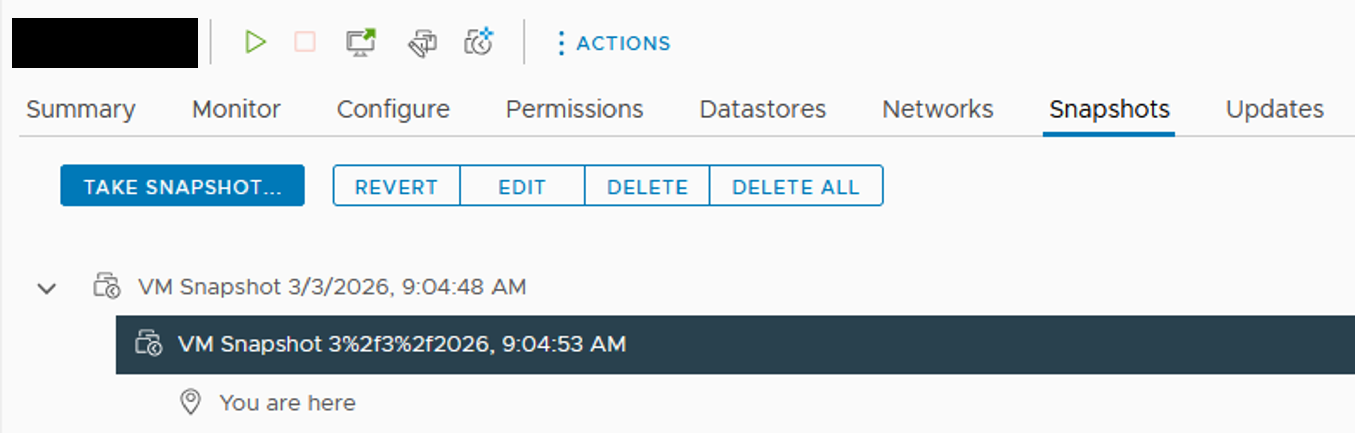 • 1つ目のスナップショット(親): VM Snapshot 3/3/2026, 9:04:48 AM