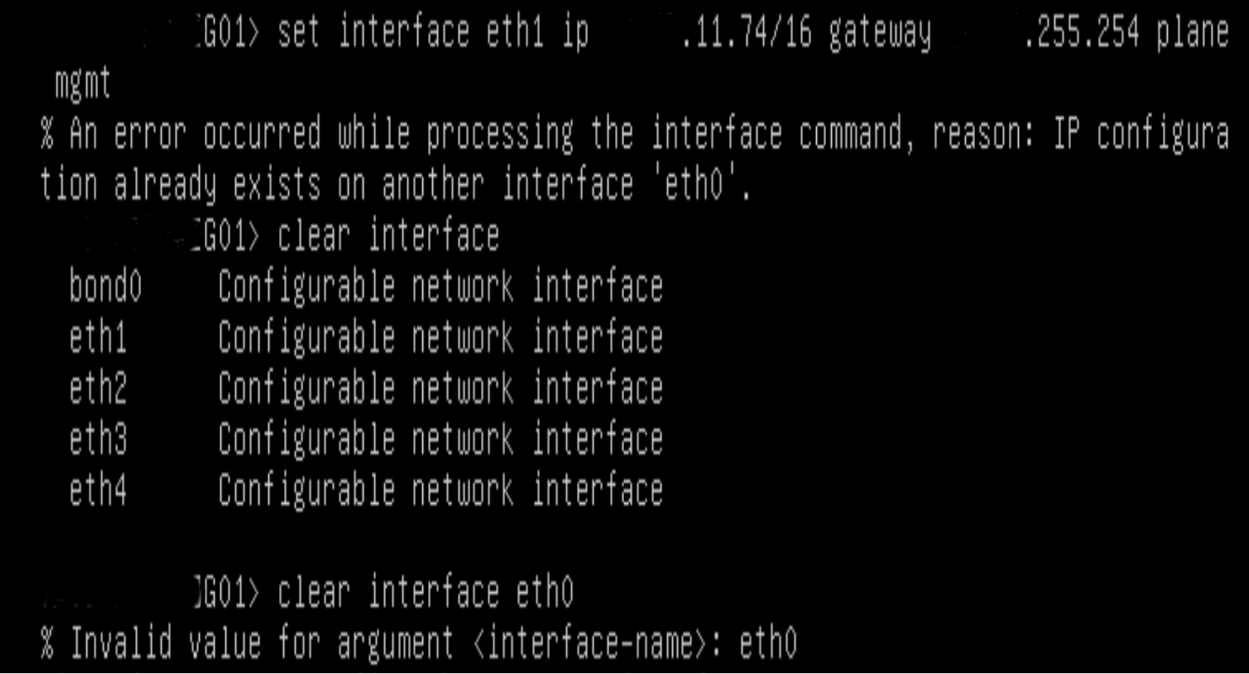 You observe the following error: "% An error occurred while processing the interface command, reason: IP configuration already exists on another interface 'eth0'." However, you do not find 'eth0' displayed in 'get interfaces'.