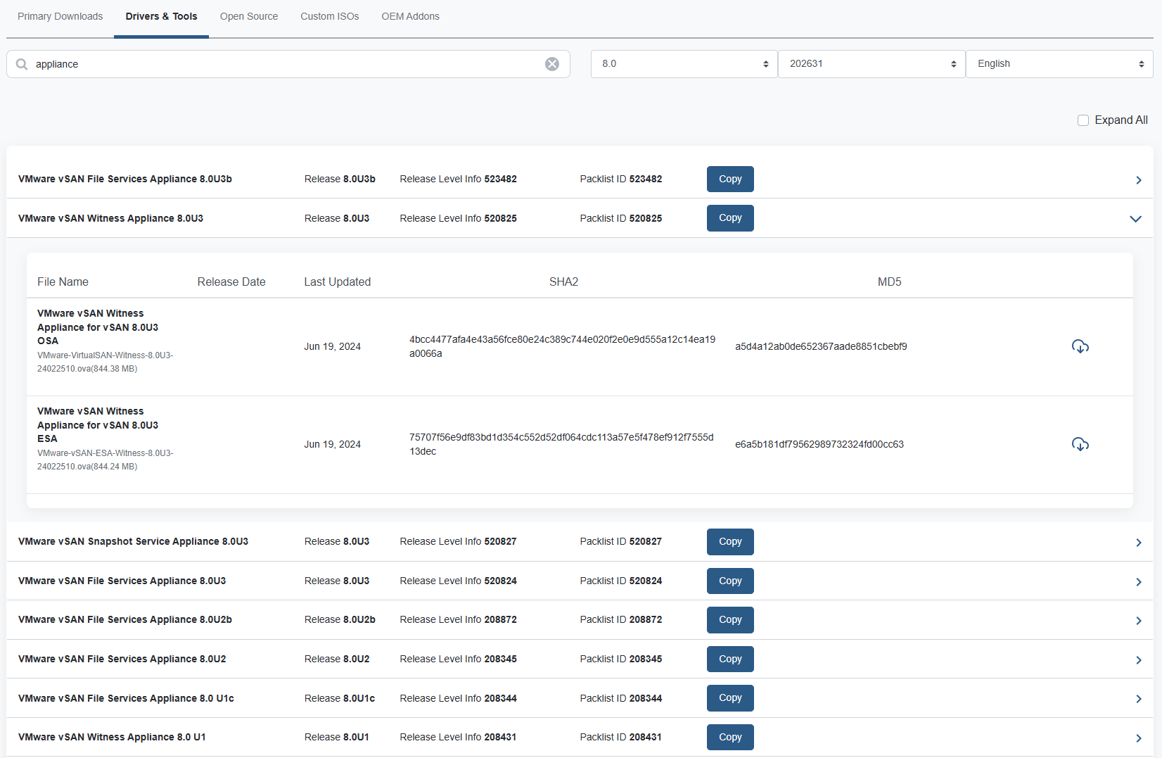 Broadcom downloads portal で、vSAN Witness Apppliance と File Service Appliance をダウンロードするページを見つける方法について記載します。