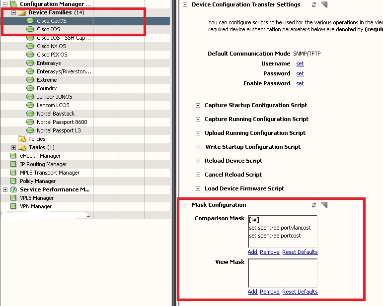 Use the Device family masks to exclude device Configuration content from configuration comparisons or to hide sensitive information from unauthorized users. You can configure Masks by expanding the Configuration Manager in One click and select any Device Family as per the screenshot below: