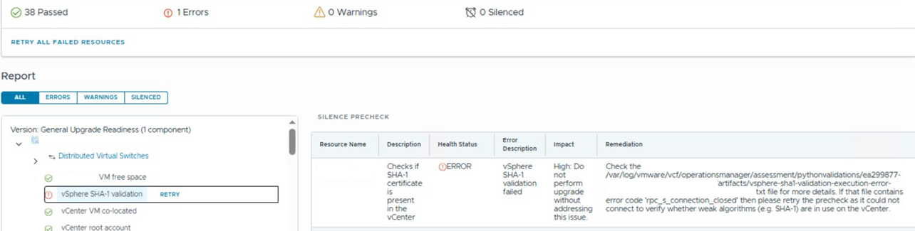 "vSphere SHA-1 validation. Support for certificates with weak signature algorithms has been removed in vSphere 8.0. Weak signature algorithm certificates must be replaced before upgrade."