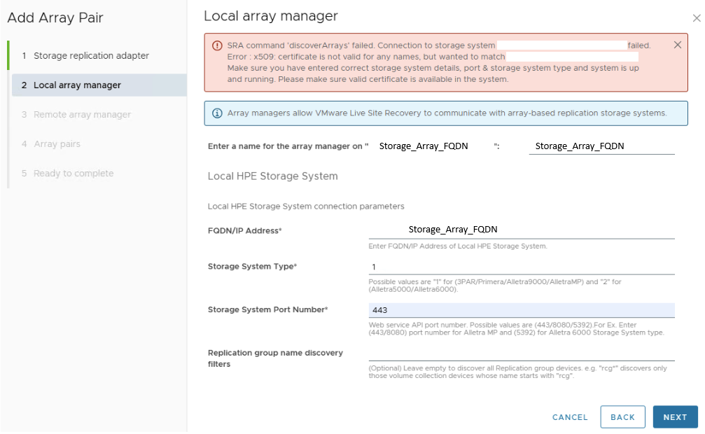 Error: SRA command 'discoverArrays' failed. Connection to storage system <Storage_array_FQDN> failed.Error : x509: certificate is not valid for any names, but wanted to match <Storage_array_FQDN>.Make sure you have entered correct storage system details, port & storage system type and system is upand running. Please make sure valid certificate is available in the system.