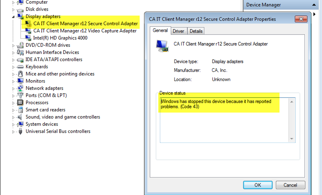 In Device Manager in Windows there is another error regarding this CA Client Manager R12 Secure Control Adapter