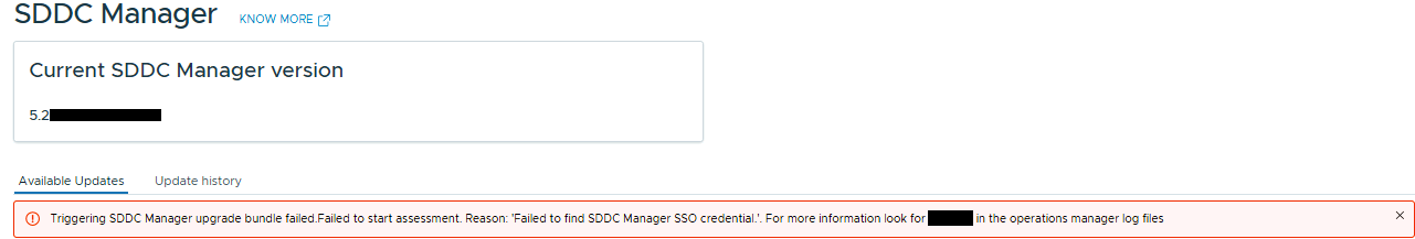 Triggering SDDC Manager upgrade bundle failed. Failed to start assessment. Reason: 'Failed to find SDDC Manager SSO credential.'. For more information look for ##### in the operations manager log files/var/log/vmware/vcf/operationsmanager.logyyyy-mm-ddThh:mm:ss.zzz+0000 DEBUG [vcf_om,<task_id>] [c.v.e.s.e.h.LocalizableRuntimeExceptionHandler,http-nio-127.0.0.1-7300-exec-5] Processing localizable exception Failed to find SDDC Manager SSO credential.yyyy-mm-ddThh:mm:ss.zzz+0000 ERROR [vcf_om,<task_id>] [c.v.e.s.e.h.LocalizableRuntimeExceptionHandler,http-nio-127.0.0.1-7300-exec-5] [#####] BASELINER_DATASOURCE_SDDC_MANAGER_CREDENTIALS_MISSING Failed to find SDDC Manager SSO credential.com.vmware.evo.sddc.orchestrator.exceptions.OrchTaskException: Failed to find SDDC Manager SSO credential. at com.vmware.vcf.baseliner.input.provider.handler.AbstractInternalDatasourceHandler.lambda$getSddcManagerCredData$4(AbstractInternalDatasourceHandler.java:156) at java.base/java.util.Optional.orElseThrow(Optional.java:403) at com.vmware.vcf.baseliner.input.provider.handler.AbstractInternalDatasourceHandler.getSddcManagerCredData(AbstractInternalDatasourceHandler.java:151) at com.vmware.vcf.baseliner.input.provider.handler.AbstractSddcManagerDataSourceHandler.getAllCredentialForProduct(AbstractSddcManagerDataSourceHandler.java:279) at com.vmware.vcf.baseliner.input.provider.handler.AbstractSddcManagerDataSourceHandler.getFilteredCredentialForProduct(AbstractSddcManagerDataSourceHandler.java:236) at com.vmware.vcf.baseliner.input.provider.handler.AbstractSddcManagerDataSourceHandler.lambda$getCredentialsForDomain$3(AbstractSddcManagerDataSourceHandler.java:176) at java.base/java.util.stream.ReferencePipeline$3$1.accept(ReferencePipeline.java:197)..yyyy-mm-ddThh:mm:ss.zzz+0000 ERROR [vcf_om,<task_id>] [c.v.v.i.b.i.TranslationMessage,http-nio-127.0.0.1-7300-exec-5] Can't find resource for bundle java.util.PropertyResourceBundle, key BASELINER_DATASOURCE_SDDC_MANAGER_CREDENTIALS_MISSING.remedyyyyy-mm-ddThh:mm:ss.zzz+0000 DEBUG [vcf_om,<task_id>] [c.v.e.s.e.h.LocalizableRuntimeExceptionHandler,http-nio-127.0.0.1-7300-exec-5] Handler Error Response:{ "errorCode": "BASELINER_DATASOURCE_SDDC_MANAGER_CREDENTIALS_MISSING", "arguments": [], "context": { "orchestrator.error.retriable": "false" }, "message": "Failed to find SDDC Manager SSO credential.", "referenceToken": "#####"}VMware Cloud Foundation 5.x
